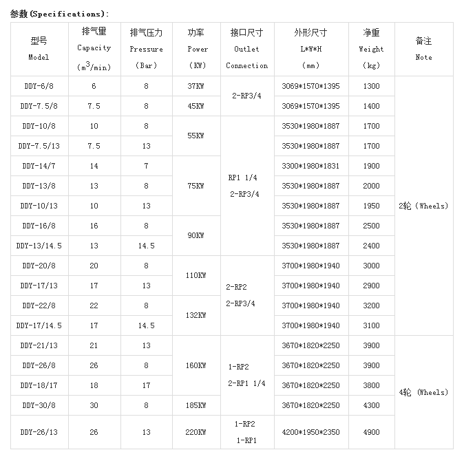 DDY 系列電動移動螺桿式空氣壓縮機技術參數